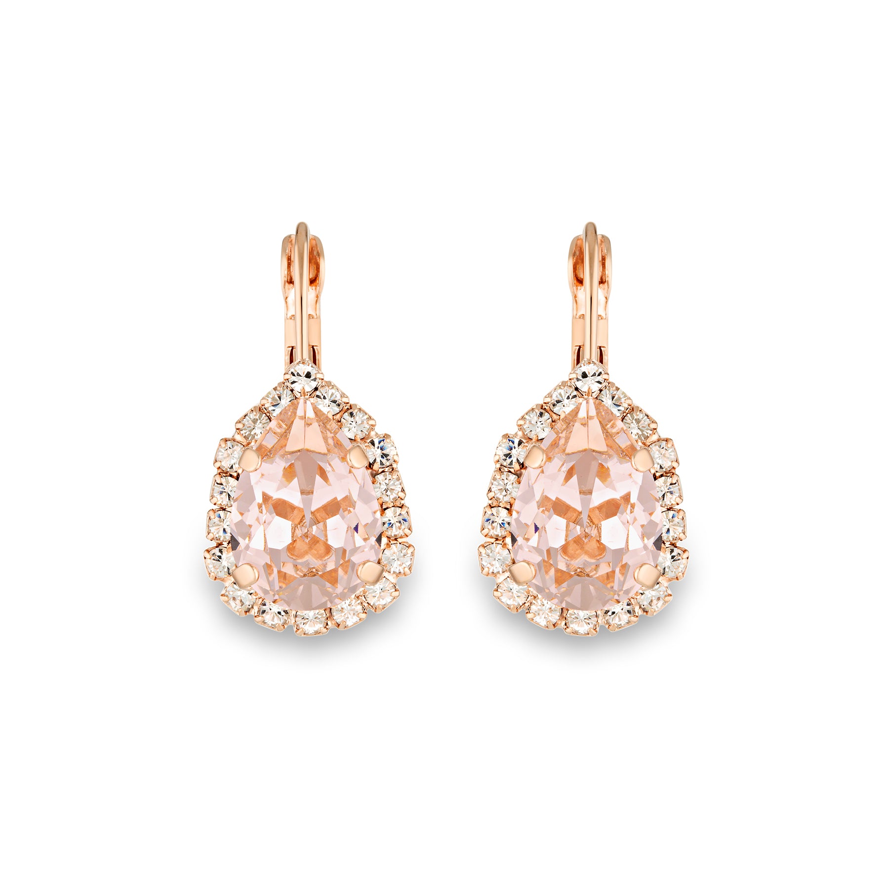 Each piece features a luminous Vintage Rose crystal in a classic teardrop cut, surrounded by a halo of delicate clear rhinestones that catch the light beautifully from every angle. With their graceful proportions and soft blush tones, they’re designed to flatter all complexions and complement both modern and vintage-inspired styles.